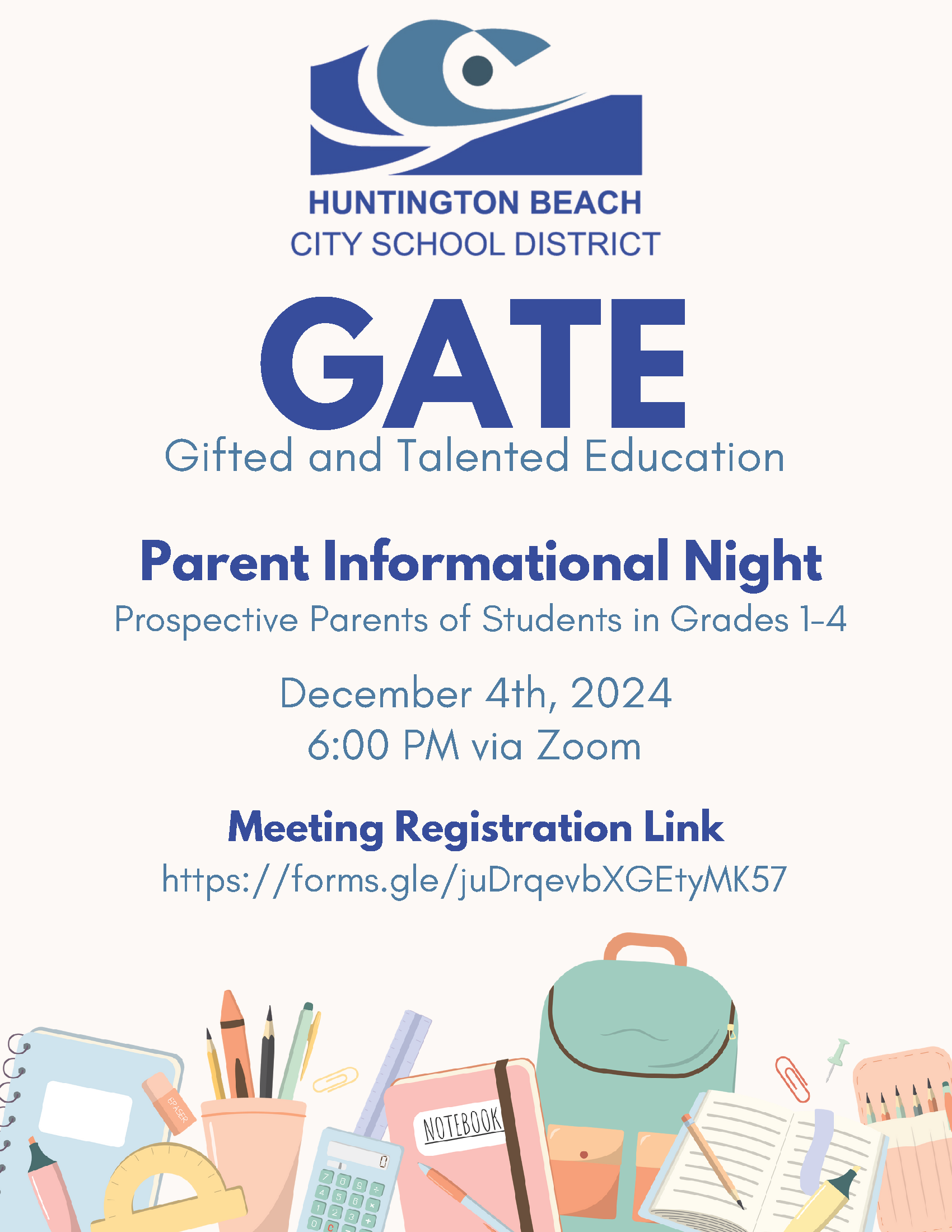 The Huntington Beach City School District will hold a Prospective GATE Parent Informational Meeting via Zoom on Wednesday, December 4, 2024, at 6:00 p.m. If you plan to attend, please register for the 2024-25 GATE Prospective Parent Informational Sessions.